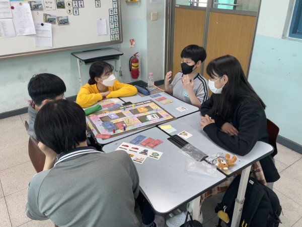 2교시: 임지현 단원이 교구 수업을 진행하였습니다. 보드게임 형식의 게임을 통해 학생들이 수업 시간에 배운 내용을 복습하고, 돈의 기능과 합리적소비에 대해 이해하는 시간을 가졌습니다.