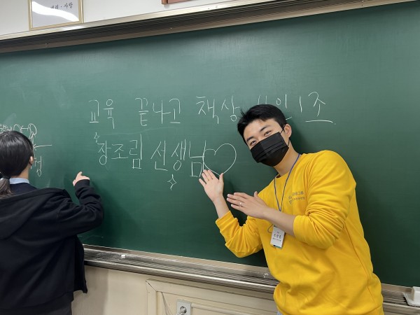 느낀점(조장훈 단원): 수업을 들어가며 전반적인 흐름을 설명하고 발표규칙 등을 정하고 수업을 진행했습니다. 이번 수업의 경우 학생들의 반응이 적었는데, 이럴 때 대처하는 방법을 학습할 수 있었습니다. 그러나 학생들이 칠판에 별명을 써주며 계속 말도 걸어주고 수업을 좋아해주어서 굉장히 뿌듯했습니다.