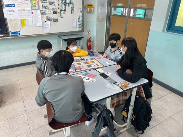 2교시: 임지현 단원이 교구를 통해 1교시에 배운 합리적 소비를 복습할 수 있도록 합리적 소비와 연관지어 규칙을 설명하고 학생들과 게임을 진행했습니다. 모둠마다 게임이 원활하게 진행되는지 중간 점검 및 학생들의 질문을 받으면서 수업을 이뤄나갔습니다.