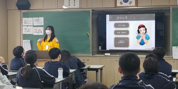 1교시: 전윤빈 단원이 ‘합리적 소비와 자산관리’에 대해 교재수업을 진행했습니다. 자기소개와 아이들의 참여를 이끌 수 있는 질문들로 시작해 학생들이 교재 속 내용과 사례를 보다 쉽게 이해할 수 있도록 본인의 경험을 예로 들며 수업을 진행했습니다.