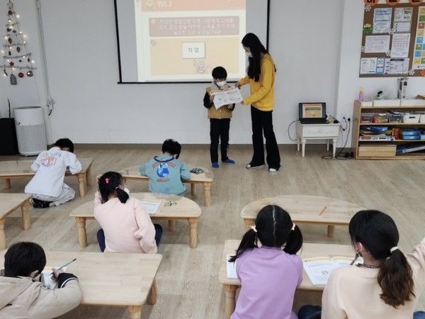 2교시 : 이혜수 단원이 진행하였습니다. 다양한 소득 활동과 직업에 대한 퀴즈를 진행하며 ‘부지런한 소득, 행복한 직업’의 내용을 복습하는 시간을 가졌습니다. ‘내 직업 찾기’ 게임을 통하여 다양한 직업을 알아보았습니다.