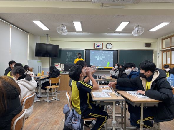 2교시 - 박호현 단원이 진행했습니다. 1교시 수업 내용을 기본으로 <튼튼한 자산관리, 아름다운 우리집> 게임을 진행했습니다. 게임 규칙을 영상을 통해 시청하고 헷갈릴 수 있는 부분을 한번 더 다시 설명하였습니다. 게임 진행을 위해 모둠을 구성하고 원활하게 참여하도록 보조하였습니다.