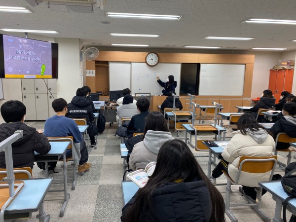 1교시: 김예지 단원이 이론 수업을 진행하였습니다. 금융이 어떤 의미인지 저축과 투자는 어떤 차이를 가지고 있는지 등을 가르쳤습니다. 학생들의 일상생활과 가까운 예시를 들어 학생들이 이해하기 쉽게 수업 내용을 가르쳤습니다.