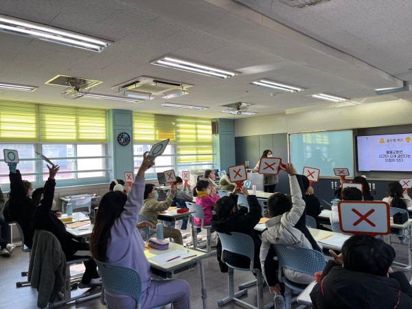 임현진 단원이 <내 친구 화폐, 현명한 소비> 교재를 바탕으로 ‘ox 퀴즈’ 프로그램을 진행하였습니다. 1교시 수업 내용에 간단한 경제 관련 문제들을 더하여 학생들의 흥미를 이끌어냈습니다. 합리적인 소비 관련 문제에서는 학생들이 헷갈릴 수 있는 예시를 통해 다시 설명하였습니다. 동점인 학생들은 1교시에 배웠던 내용을 바탕으로 퀴즈를 진행하여 상품을 증정하였습니다. 마지막에는 이전에 배운 내용을 함께 정리하는 시간을 가졌습니다.