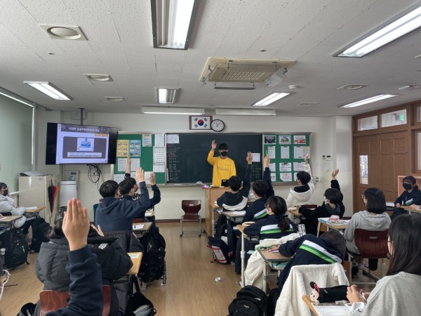 : 1교시 - 박호현 단원이 진행했습니다. 첫수업임을 감안하여 선생님에 대한 소개와 흥미를 끌 수 있는 간단한 퀴즈와 밸런스게임을 통해 학생들의 관심을 유발하였습니다. 동영상 시청을 통해 금융을 소개하고, 금융기관의 유형을 소개하였습니다. 그후 저축의 필요성에 대해 설명하고 저축상품의 유형에 대해 함께 이해하는 시간을 가졌습니다. 투자에 대하여 알아보고 투자와 저축의 차이를 이해한 후 올바른 투자방법을 공부하였습니다.