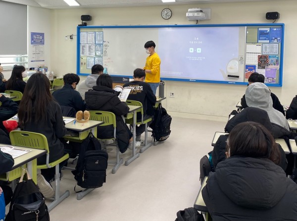 1교시: 정수현 단원이 교재를 바탕으로 학생들에게 합리적인 소비의 중요성을 강조했습니다. 더하여 자산관리를 학생들의 눈높이에 맞춰 쉽게 설명해 줬습니다.