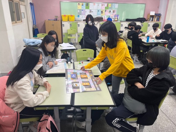 2교시(송하윤): 1교시에 배운 금융경제 수업 내용을 복습하고, 교구 수업에 앞서 게임 규칙을 설명하였습니다. 경제보드게임을 통해, 학생들이 경제 용어와 경제 지식을 재미있게 익힐 수 있도록 하였습니다. 추가 설명을 덧붙이며, 게임이 원활히 진행되도록 도왔습니다.