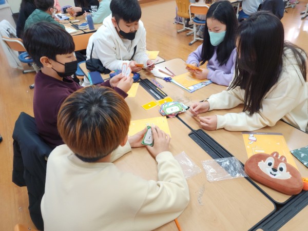 2교시 - 수업에 들어가기전 1교시에 배운 내용(돈의 4가지 기능)을 복습후 '돈카드'게임을 진행하였습니다. 교실을 돌아다니며 학생들이 모두 게임에 잘 참여할 수 있도록 지도하였으며 3~4번 게임 진행 후 마지막 정리와 함께 수업을 마무리 하였습니다.