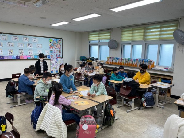 2교시: ‘돈 카드 게임’ 설명 동영상을 시청하고 다시 한 번 ‘돈 카드 게임’을 설명하여 아이들이 게임의 이해도를 높인 상태에서 게임을 진행하였습니다. 아이들끼리 게임을 진행하면서도 다양한 나라의 화폐와 돈의 4가지 기능(교환수단, 가치비교수단, 가치저장과 이전수단, 대가지불수단)에 대해 설명해주어 게임 참여를 유도하였습니다.