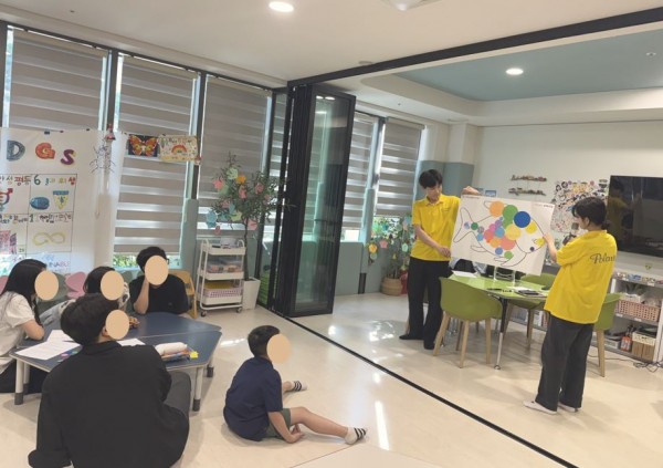 1교시(이다영): 무지개 물고기 동화책을 읽어주며 나눔의 중요성에 대한 부분을 강조하였다. 책에서 주인공이 자신의 아름다운 비늘을 나눠주며 행복을 느끼는 점을 이해하도록 유도했다.