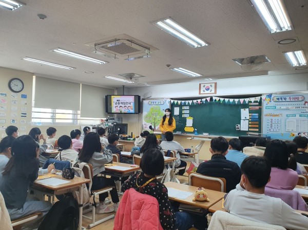 김보경 단원이 진행하였습니다. <신기한 돈 합리적인 소비> 내용을 바탕으로 2교시 프로그램인 ‘금융게임천국’을 진행했습니다. 게임을 이해하지 못하는 학생이 없도록 중간중간 작성 내용을 확인하는 등 소외되는 학생이 없도록 진행하였습니다. 퀴즈마다 1교시 수업 내용과의 연관성을 설명하며 학생들이 게임을 통해 더 많이 배워갈 수 있도록 구성하였습니다. 또한 퀴즈가 과열될 때 적절한 대처로 수업에 차질이 없게 잘 진행했습니다.