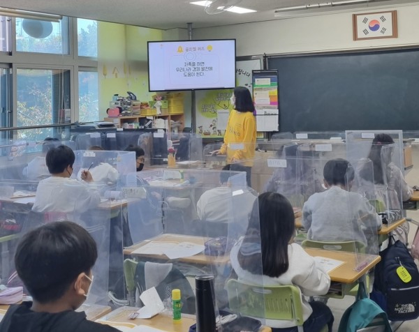 임현진 단원이 <부지런한 일꾼, 차곡차곡 저축> 교재를 바탕으로 ‘ox 퀴즈’ 프로그램을 진행하였습니다. 1교시 수업 내용에 간단한 경제 관련 문제들을 더하여 학생들의 흥미를 이끌어냈습니다. 저축 관련 문제에서는 학생들이 어려워하는 예금과 적금의 차이를 다시 설명하였습니다. 퀴즈를 보고 정확히 어느 영상에 나왔던 부분인지 대답하는 학생이 있을 정도로 적극적인 모습을 보여주었습니다.