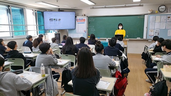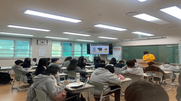 1교시 - 구경모 단원이 수업을 진행하고 금융의 의미, 금융기관의 역할, 저축과 투자에 대해 알아보는 시간을 가졌습니다. 학생들의 주식 경험이나 은행 방문 경험, 예금과 적금 중 더 마음에 드는 것을 물어보는 등 학생들의 참여를 이끌었습니다.