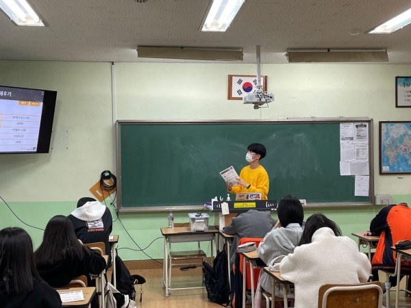 : 1교시 - 이석희 단원이 진행했습니다. 선생님의 소개와 간단한 퀴즈로 학생들의 관심을 유발했습니다.