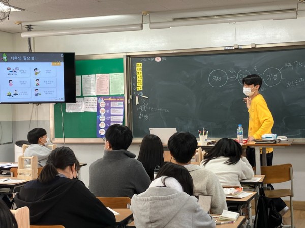 1교시 : 강사 소개 및 간단한 퀴즈를 진행하며 아이들의 흥미와 집중을 이끌어 냈습니다. 금융의 개념에 대한 영상을 시청하여 아이들에게 금융의 의미를 정확히 인식 시켰으며 여러 금융기관들을 소개하고 역할을 설명 하였습니다. 그 후 저축과 투자의 개념과 중요성에 대한 설명을 하였고 아이들의 눈높이에 맞는 예시를 들어 여러 투자상품을 소개 시켜주었습니다. 또한 현명한 투자자가 되기 위한 방법에 대해 수업 하였고 분산투자의 개념과 필요성에 대해 설명하였습니다. 마지막으로 크라우드 펀딩을 쉽게 뜻을 풀어서 설명하였고 여러 사례를 소개 시켜 주었습니다.