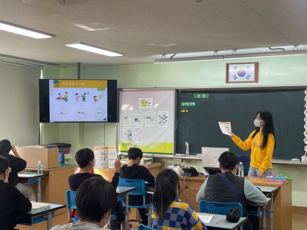: 1교시 - 주선영 단원이 진행했습니다. 수업 시작 전 선생님에 대한 퀴즈를 풀어 주의를 환기시키고,