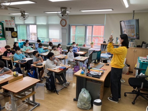 1교시: 정현빈 단원이 돈의 개념, 돈의 기능 그리고 돈의 모습이 어떻게 변화해 왔는지 쉽게 이해할 수 있도록 설명하며 수업을 진행하였습니다.