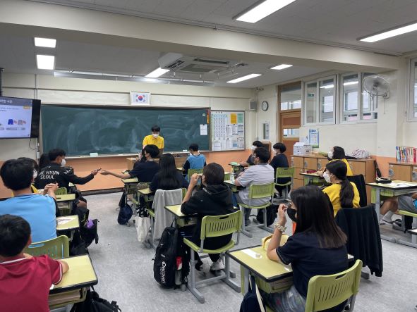 2교시: 이시혁 단원이 교재 수업에 이해도를 높이기 위해 보드게임을 활용한 교구 수업을 진행하였습니다. 수업을 진행하며 질문을 받고, 게임이 원활하게 진행될 수 있도록 도와주는 역할을 맡았습니다.