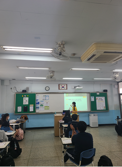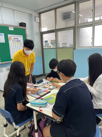 1교시 : 최시영 단원이 교재 수업을 진행하였습니다. 학생 수가 다른 학교들에 비해 많지 않아 단원이 한 명 한 명에게 질문을 하고 답변을 들을 수 있었습니다. 특히 자산관리 계획을 세울 때 단원이 학생들에게 직접 다가가 교재의 내용들을 살펴보며 면밀히 소통하며 수업을 진행할 수 있었습니다. 학생들 개개인이 가지고 있는 소비 습관들을 알아보고 앞으로 어떤 소비 생활을 이어가야하는지 생각해보는 시간을 가졌으며 자산 관리에 있어 다양한 상품들을 알아보고 미래 자산 계획을 세워보는 시간을 가질 수 있었습니다.