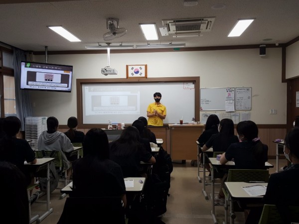 2교시: 5모둠으로 나누어 크라우드 펀딩 게임을 진행했습니다. 게임 활동을 하면서 모든 모둠이 즐겁게 게임에 참여하였습니다. 단원들은 각 모둠을 돌아다니며 학생과 적절히 상호작용하고 게임에 대한 질문에 답을 하며 원활한 게임의 진행을 도우는 역할을 했습니다. 게임을 마친 이후에는 게임에서 우수한 성적을 거둔 모둠에게 상품을 증정하였습니다.