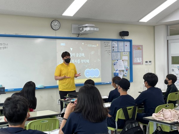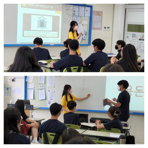 1교시: 원시후 단원이 이론 수업을 진행하였습니다. 학생들에게 금융에 대한 전반적인 이해를 돕기 위해 100원을 가지고 학생들 간의 물건을 사는 활동을 하였습니다. 돈의 흐름을 의미하는 금융과 돈의 가치에 대해 직접 체득할 수 있는 수업을 진행하여 학생들이 경제에 대해 흥미롭게 다가설 수 있도록 하였습니다.