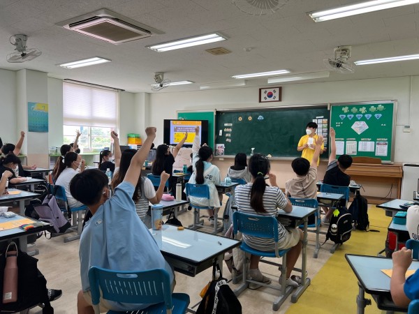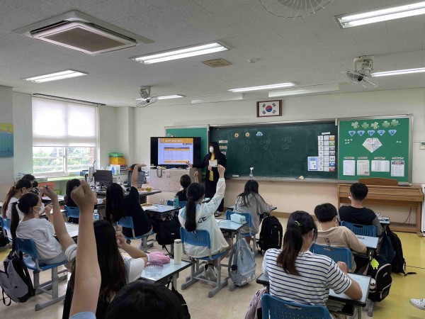1교시에는 류채은 단원이 신기한 돈, 합리적 소비 교재로 수업을 진행했다. 돈의 네가지 기능에 대해 학생들에게 설명을 해주고 학생들의 눈높이에 맞는 예시를 들어 학생들의 이해를 도왔다. 그리고 환율의 개념을 학생들에게 질문을 함으로써 설명하였다. 더불어 류채은 단원은 자신의 모교에서 수업을 하게되는 특별한 시간이었다.