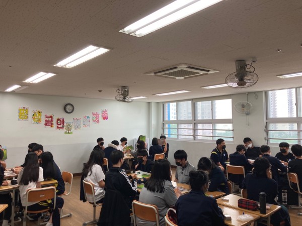 2교시: 1교시에 배웠던 내용을 다시 한번 정리해보고, 이를 바탕으로 골든벨 게임을 진행하였습니다. 골든벨 게임을 통해 수업 내용을 복습을 한 뒤, 교구를 이용하여 '튼튼한 자산관리 아름다운 우리집' 게임을 진행하였습니다. 모든 활동을 마친 뒤, 설문지 작성을 하고 질의응답을 통해 학생들이 수업과 관련하여 궁금했던 부분을 알아갈 수 있도록 하였습니다. 그리고 마지막으로 학생들과 같이 사진을 찍는 시간을 가졌습니다.