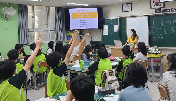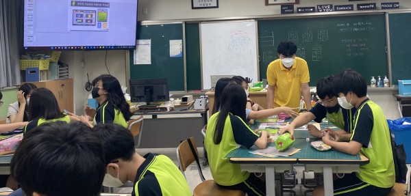 2교시: 김진형 단원이 교구를 이용한 게임을 진행했습니다. 동영상 시청 후 조를 편성하여 게임을 진행했습니다. 게임의 중요 포인트를 묻는 방식으로 이해를 도왔습니다. 또한 질문이 있는 학생들에게 다가가 답변하며 게임의 이해를 도왔습니다.