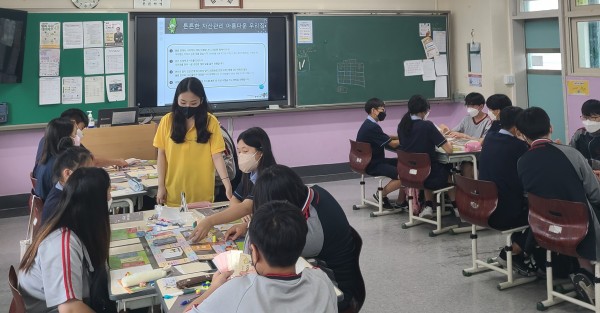2교시: 방수민 단원이 교구를 이용한 게임을 진행했습니다. 동영상 시청 후 조를 편성하여 게임을 진행했습니다. 게임의 중요 포인트를 묻는 방식으로 이해를 도왔습니다. 또한 질문이 있는 학생들에게 다가가 답변하며 게임의 이해를 도왔습니다.