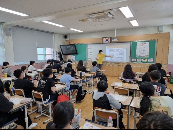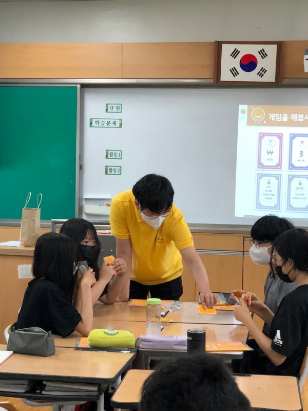 2교시 - 1교시에 배웠던 돈의 4가지 기능과 여러 나라의 돈을 이용해 '돈 카드 게임'을 진행했습니다. 학생들에게 익숙한 '원 카드 게임'의 방식과 비슷한 규칙을 사용하여 익숙하고 재미있게 게임을 할 수 있었습니다. 활동이 끝난 후 골든벨 퀴즈를 풀어보며 오늘 학습했던 내용을 복습하는 시간을 가졌습니다.