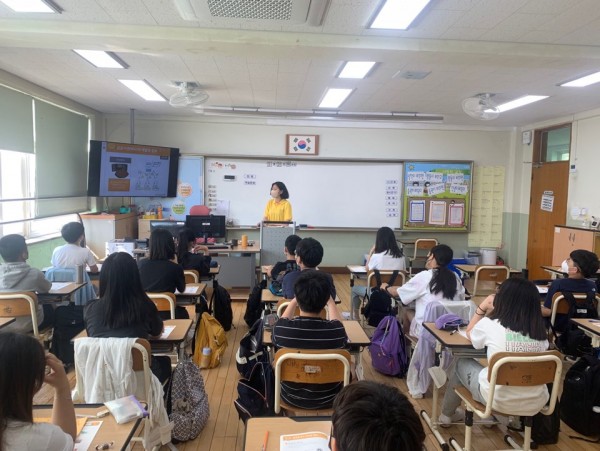 윤희선 단원이 <금융을 알고 투자를 해요!>교재를 바탕으로 1교시 수업을 진행했습니다. 수업 시작 전 저축과 투자를 해본 경험이 있는지 아이들에게 물었을 때, 많은 친구들이 해봤다고 답했고 주식 투자를 해본 학생들도 꽤 있어서 기초 금융 지식이 풍부한 상태였습니다. 수업 내용과 함께 깜짝퀴즈를 통해 학생들이 궁금할 만한 내용들에 대한 보충 설명을 하였습니다. 학생들이 수업 중간에도 궁금한 점들을 적극적으로 질문해줘서 더욱더 알찬 수업을 만들어 나갈 수 있었습니다.