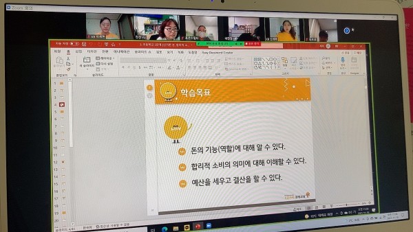 신세희 단원이 진행했습니다. 책에 있는 학습 목표를 함께 읽어보며 시작했습니다. 돈은 어떤 기능을 하는지, 우리나라의 돈, 외국의 돈 환율, 환전, 합리적인 소비를 하는 방법 등 여러가지 내용을 배웠습니다. 해당 수업은 부득이하게 줌으로 진행되었지만, 함께 화면공유를 통해 영상을 시청하고 댓글로 발표를 자원하는 등 양방향 소통이 가능한 수업이 되도록 노력한 수업이었습니다.