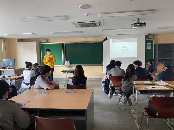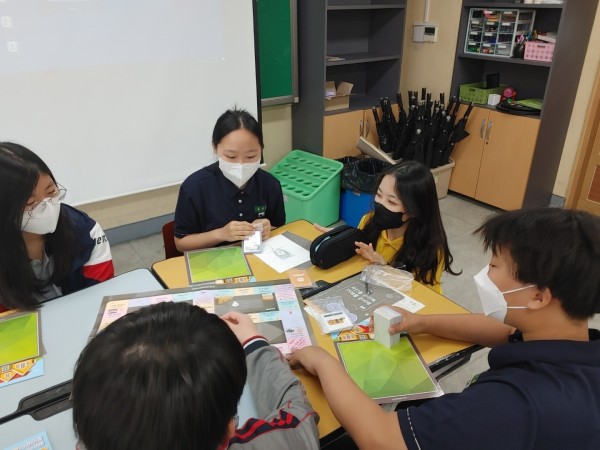 강의내용 : 1교시에는 권준혁 단원이 교재수업을 진행하였으며 교재를 바탕으로 강의를 진행하였으며 학생들이 실생활에서 접해봤을 혹은 매체를 통해서 대략적으로 알고 있는 용어에 대해서 설명을 하고 질문을 받으며 참여를 이끌고자 하였다. 이론수업 이후 학생들이 궁금해 할 만 한 경제 관련 질문 및 기타 질문을 받아 흥미를 돋구었다. 2교시에는 방수민 단원이 교구수업을 진행하였으며 게임을 통해서 학생들이 경제용어를 쉽게 이해할 수 있도록 도왔으며 그 결과, 5개의 조 모두 활발하게 참여하였다. 학생들에게 간식을 제공하여 참여를 이끌었다. 학생들에게 친근하게 다가가 편하게 대할 수 있도록 하였으며 게임 도중 일부 언쟁이 있을 경우에 중재를 하여 원만히 게임이 이뤄지도록 하였다.