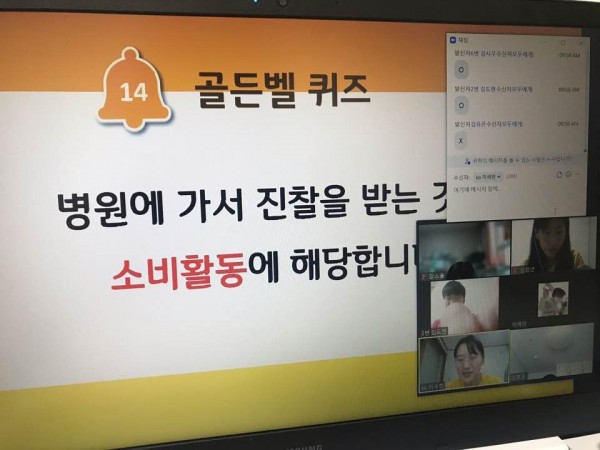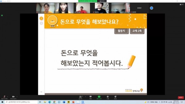김민선 단원이 진행했습니다. 돈의 기능에 대해 예시와 함께 설명해주었으며, 환전과 환율의 개념에 대해서 설명하면서 퀴즈로 환율은 변동한다는 점을 알려주었습니다. 또한 영상을 보고 질문을 하여 학생들의 이해도를 파악하기도 했습니다. 그리고 수업에 적극적으로 참여해준 학생들에게는 기프티콘을 전달했습니다. 온라인으로 진행되어 소통에 대한 걱정을 했지만 마이크와 채팅 기능을 활용하여 활발하게 소통할 수 있었으며, 잘 마무리할 수 있었습니다.