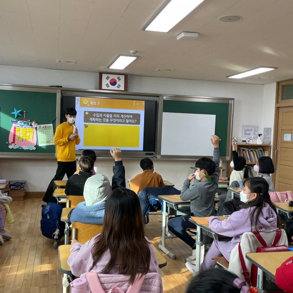 1교시 : 수업을 시작하며 선생님 소개와 폴라리스 단체 설명을 하고 간단한 아이스 브레이킹 시간을 가지며 게임을 진행해 친밀감을 형성하고 수업을 진행하였습니다. 돈의 기능(교환수단, 대가지불수단, 가치비교수단, 가치저장과 이전수단)을 설명하고 각 가능의 예시를 들어주어 설명을 도왔습니다. 그리고 직접 경험해본 일을 발표하는 시간을 가졌습니다. 세계 여러 나라의 돈을 설명할때는 사진자료를 활용하여 각 나라 화폐의 다른점을 설명해주었고 예산과 결산은 용돈기입장을 중심으로 설명했습니다. 설명을 마친후 직접 예산과 결산 세우기 활동을 해보고 수업을 마쳤습니다.