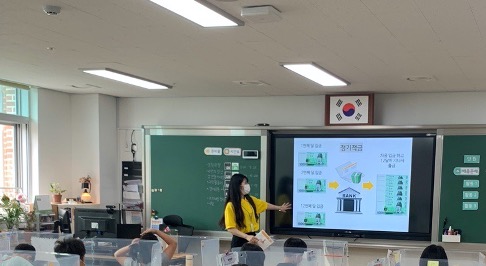 1교시에는 정유진 단원이 돈으로 할 수 있는 일, 소득의 종류, 저축의 필요성, 은행의 저축상품 중 보통예금, 정기적금, 정기예금에 대한 이론 수업을 진행했습니다. PPT자료에 다양한 사진자료를 추가하여 이해하기 쉽고 재미있게 설명했고, 어려운 단어들을 쉽게 말로 풀어 설명하여 이해를 도왔습니다. 이론수업이 끝난 후, 골든벨 퀴즈를 통해 배웠던 내용을 정리하는 시간 또한 가졌습니다.