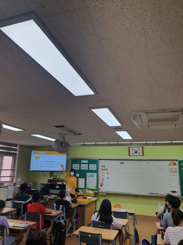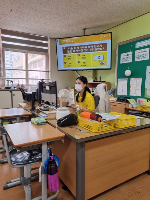 1교시(박진아 단원) : 초등학교 5학년 대상으로 교재와 ppt를 이용해 수업을 진행했습니다. 아이들에게 환전과 환율의 의미, 합리적 소비를 하는 기준을 결정하는 방법과 예산, 결산의 의미와 세우는 방법을 예시를 통해 쉽게 설명해주었습니다.