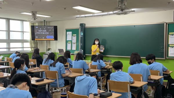1교시에는 금융의 의미, 은행, 증권회사, 보험회사, 여신전문금융회사, 금융유관기관 등의 금융기관(회사), 저축, 투자 및 현명한 투자를 하기 위한 방법에 대한 이론수업을 진행했습니다. 금융이라는 개념을 잘 이해할 수 있도록 그를 중점적으로 설명했고, 최근 주목받고 있는 투자 방법인 크라우드펀딩에 대해서도 실제 예시를 들어 이해하기 쉽게 설명했습니다. 또한 어려운 단어들을 쉽게 말로 풀어 설명하여 이해를 도우려 노력했습니다.
