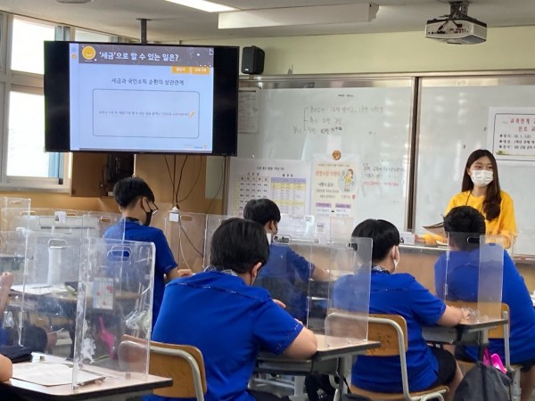 김은빈 단원이 진행했습니다. 돈과 관련된 속담을 찾아보며 흥미를 이끌어내려 하였지만 소수의 아이들만 속담을 알고 있었기에 힌트를 주고 뜻을 최대한 이해하기 쉽게 설명하였습니다. 크게 소득, 세금, 신용관리, 보험 4가지 개념으로 나눴고, 다양한 소득의 유형을 설명하던 중 친구들의 이름을 빌린 예시를 들어 흥미를 이끄는 데 성공하였습니다. 간접세를 설명할 때는 실제 사용했던 영수증을 삽입하여 아이들의 눈높이에 맞춰 설명하였습니다. 신용등급 부분 또한 신용점수제로 변경된 이유와 두 제도의 차이에 대해 명확히 이해할 수 있도록 노력하였습니다.