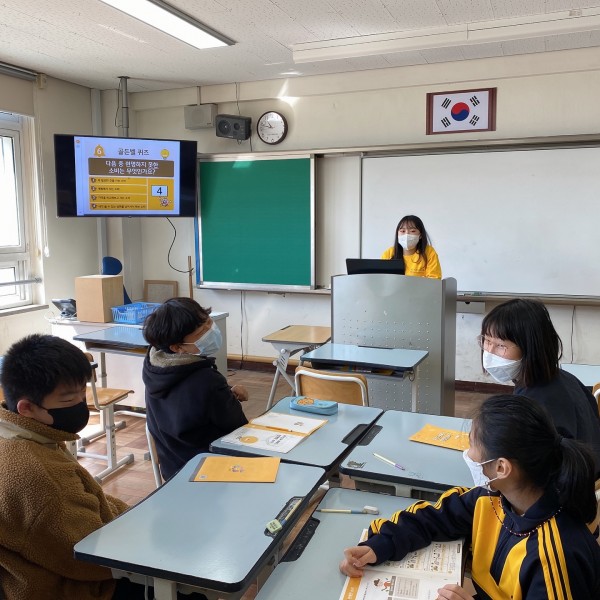 2교시 수업은 김지현선생님이 담당하였습니다. 골든벨퀴즈를 하면서 1교시 수업내용을 복습하는 시간을 가졌습니다. 물물교환 게임을 진행하면서 실제 화폐가 없었을 때 불편한 점을 알게 되는 시간이였습니다. 아이들이 게임을 굉장히 좋아하여서 뿌듯하였습니다.
