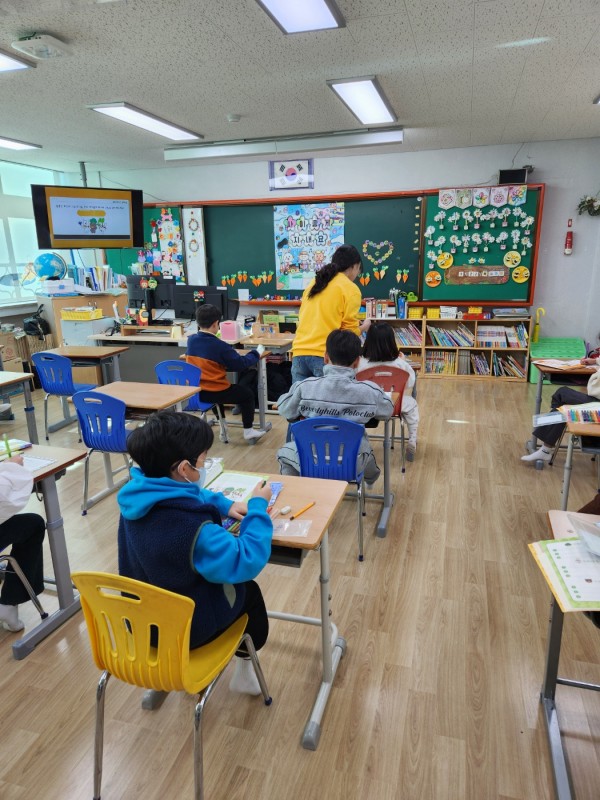 - 2교시 : '스타프렌즈 색칠 대작전'이야기를 아이들과 함께 읽으며 내용 중간중간 나오는 문제를 함께 풀어보았습니다. 2교시라 집중도가 다소 떨어지는 모습을 보여 한명한명에게 읽을 수 있는 기회를 주어 읽게 하였으며, 총 4개의 문제를 1교시에 배웠던 내용을 기반으로 풀어보았습니다.