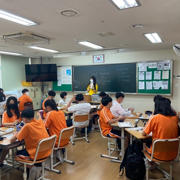 2교시(교구) : 크라우드펀딩 개념설명후 모둠별로 짝을 지어 상품제안서 게임을 진행하였습니다. 각 모둠마다 1000만원이라는 돈을 가지고 6개 조를 만들어 각 조마다 앞에 나와 칠판에 자신의 제안서를 작성하고 발표하였습니다. 각 조는 자신의 조의 상품제안을 제외하고 나머지 조에 돈을 분배하도록 하였고, 6개모둠중 자동차 관련 제안서를 발표한 4조가 1등을 하였습니다. 역할분담 및 활동진행 모두 적극적으로 참여해주었습니다.