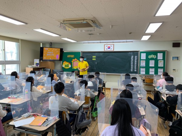1교시: 박상엽 단원이 돈의 4가지 기능인 교환수단, 대가지불수단, 가치비교수단, 가치저장과 이전수단을 학생들의 눈높이에서 알기 쉽게 설명했습니다. 외국에 나갔을 때의 상황을 가정해 학생들로 하여금 환전과 환율의 개념을 설명했습니다. 합리적인 소비의 개념과 필요성에 대해 이해하고, 예산과 결산을 학습해 학생들로 하여금 용돈기입장을 스스로 작성할 수 있도록 학습의 시간을 가졌습니다.