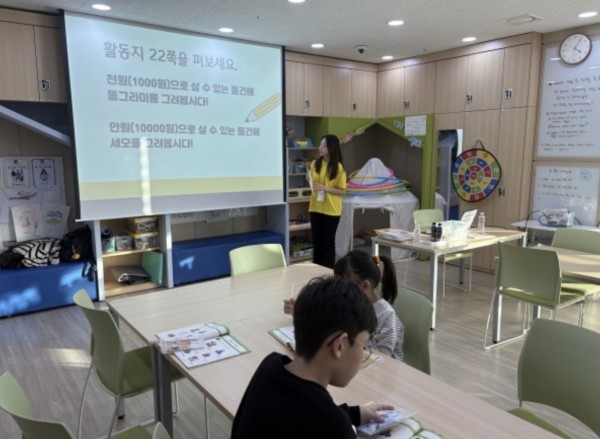 '스타프렌즈 색칠 대작전-경제마왕에게 빼앗긴 색깔을 되찾아라!'활동을 진행했다. 아이들이 문제를 같이 읽는 방식으로 수업에 직접 참여하며 이해도를 높일 수 있도록 하였다. 퀴즈를 통해 앞에 학습했던 내용과 이어서 어떤 소비 습관이 잘못된 것이고 어떻게 소비해야 현명한 소비인지 한번 더 강조했다. 퍼즐을 색칠할 때 보조선생님과 함께 아이들의 진행속도를 체크하며 수업을 이끌어나갔다.
